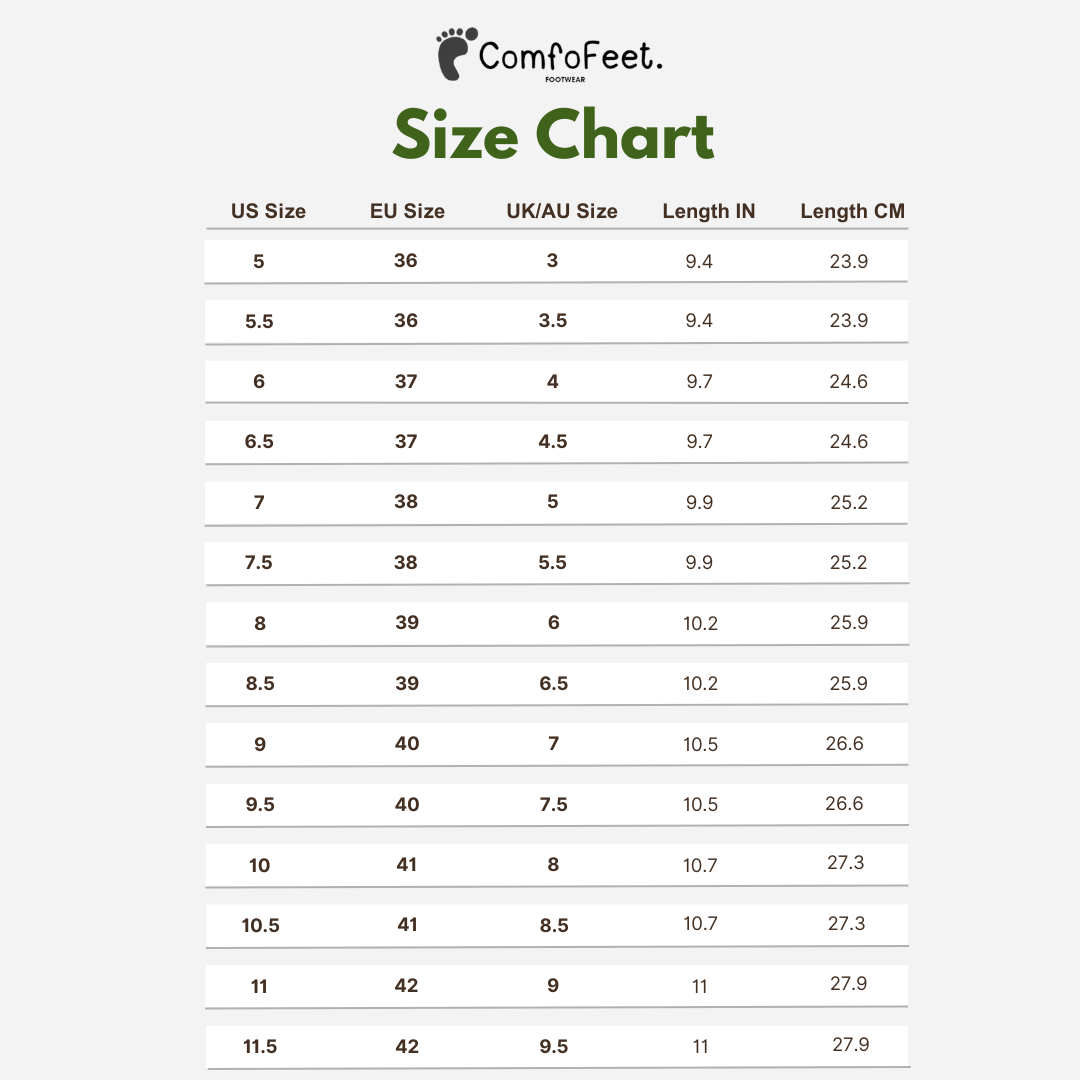 It's important to select the right size for optimal comfort. We recommend measuring your feet at the end of the day when they are at their largest. Refer to our size chart and choose the size that best matches your foot measurements. If you're between sizes, opt for the larger size for extra comfort.